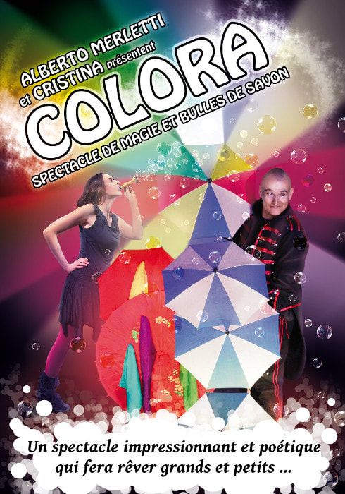 Colora est un spectacle visuel et interactif, crée pour amuser et faire participer le public. Le magicien Alberto Merletti et son assistante Cristina vous emportent dans une atmosphère féerique et poétique, à travers des numéro visuels : les objets volent, les foulards dansent et les bulles de savon sont géantes … l’humour trouve aussi sa place dans le spectacle Colora, avec des tours de magie interactifs et la participation des spectateurs.